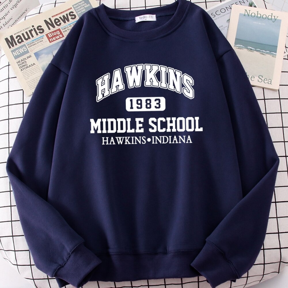 Pohodlná unisex mikina bez kapuce "Hawkins Middle School" s motivem seriálu Stranger Things. Je vyrobena z kvalitního polyesteru a spandexu a nabízíme ji v mnoha barvách a velikostech. Tabulku doporučených velikostí naleznete níže, pro lepší fit vybírejte větší velikost. Pro pomoc s měřením použijte obrázek níže.