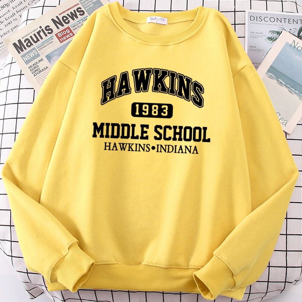 Pohodlná unisex mikina bez kapuce "Hawkins Middle School" s motivem seriálu Stranger Things. Je vyrobena z kvalitního polyesteru a spandexu a nabízíme ji v mnoha barvách a velikostech. Tabulku doporučených velikostí naleznete níže, pro lepší fit vybírejte větší velikost. Pro pomoc s měřením použijte obrázek níže.